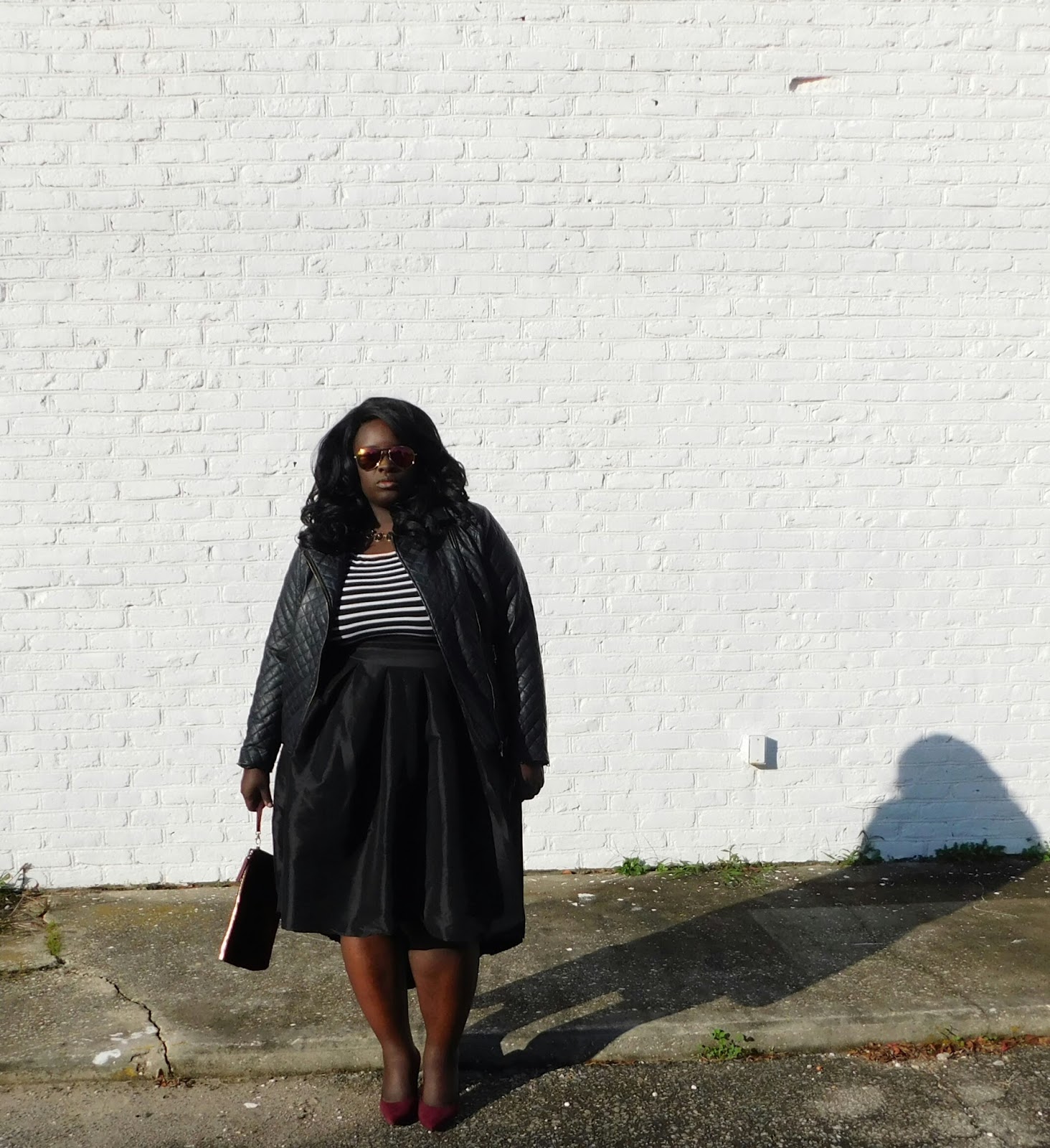 When I saw the style post, I knew I had to recreate it. The look embodied three of my favorite items black and white stripes, a motto jacket and the color wine/burgundy. Just a reminder the F.I.A post are all based on items I already own. I stayed true to the color scheme and remixed the pieces. I used a black and white stripe instead of the white with black in the inspiration pic. The skirt is tulle in the picture, however I don't own a tulle skirt so I had to improvise. I do own a black full high low skirt and decided to go with that. When it came to accessories, the colors were on point the only difference was the bag texture. The bag I used was velvet, the pumps are suede like the inspiration pic and the necklace was black and gold. To top off the look, the pic had a wine colored jacket that I am crushing on. The jacket I have is black. I realized a cute detail, the pattern on the bag in the inspiration pic is the pattern that is on my jacket.